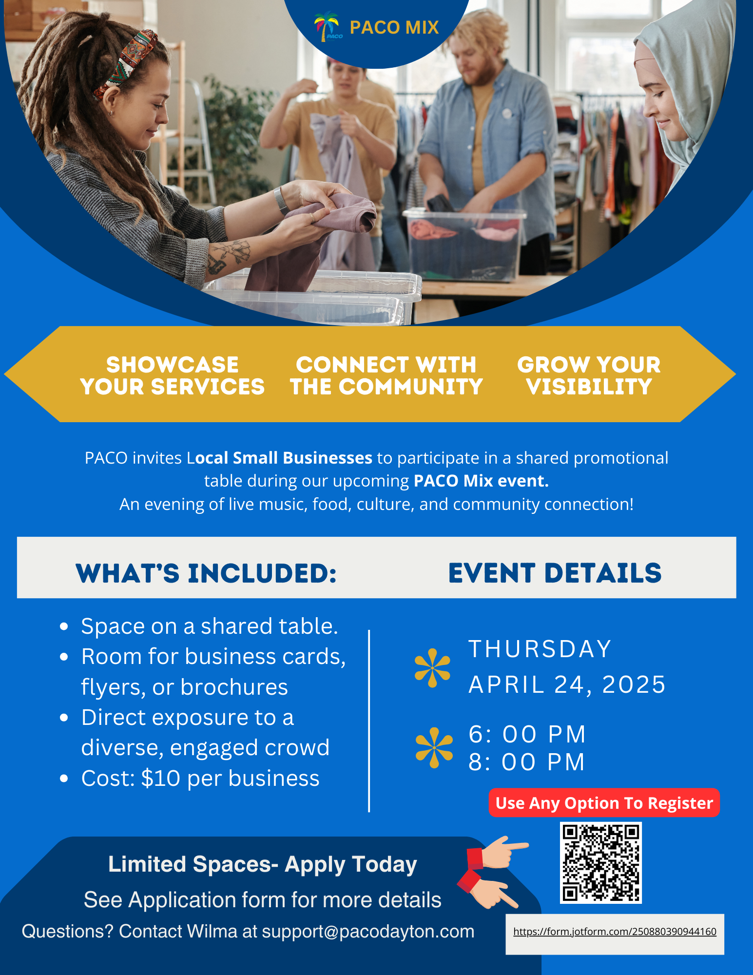 PACO invites local small businesses to participate in a shared promotional table during our upcoming PACO Mix event, an evening filled with live music, food, culture, and community connection!